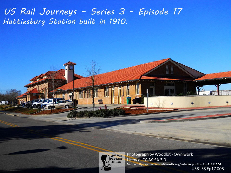Hattiesburg station is also known as Union Station and the New Orleans & Northeastern Passenger Depot. The station is the last regular stop before reaching New Orleans.