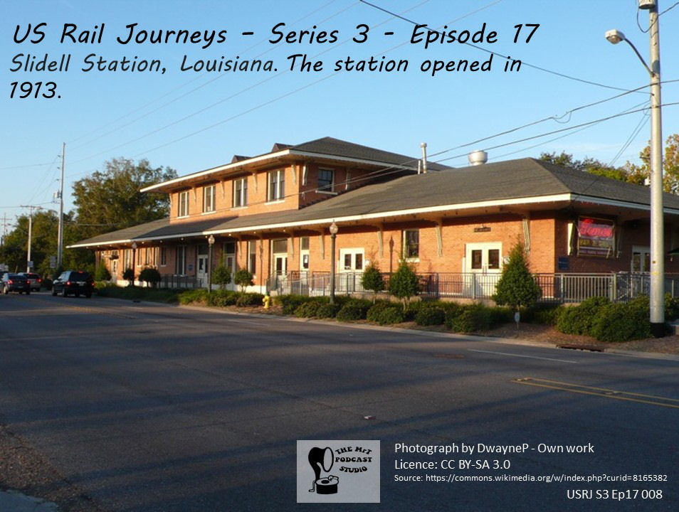 The flag-stop at Slidell station dates from 1913. It was built for the New Orleans and Northeastern and the New Orleans Great Northern Railroads. Slidell was established in 1881 as a construction camp for the NO&NE and is across Lake Pontchartrain from New Orleans.
